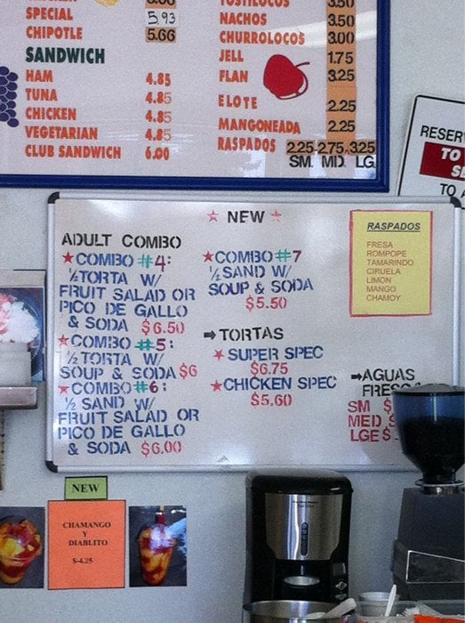 1/2 torta, lata de refresco y ensalada de frutas o pico de gallo. 1/2 torta, canned soda and fruit salad or pico de gallo.